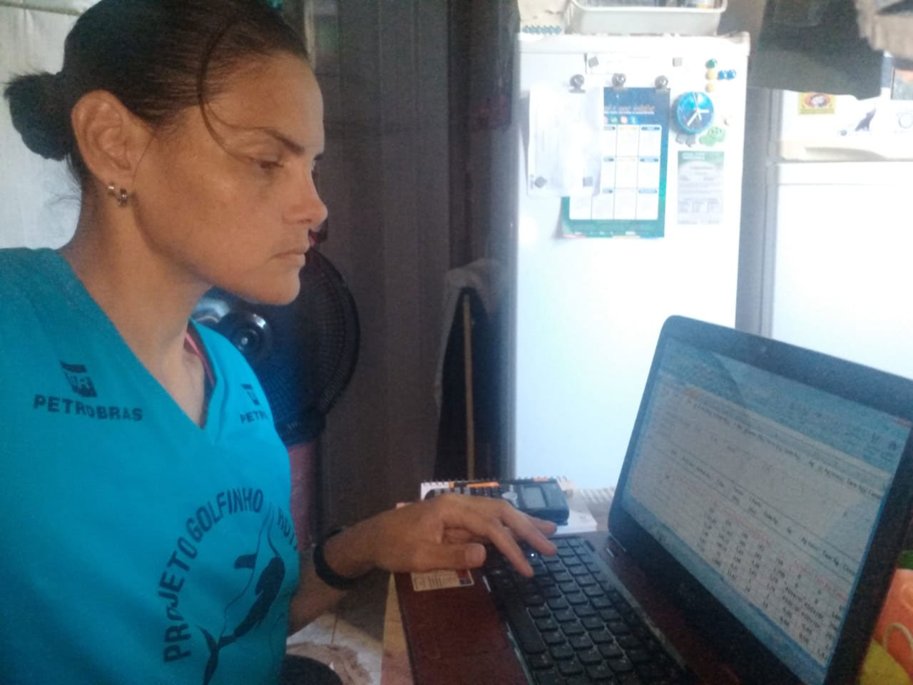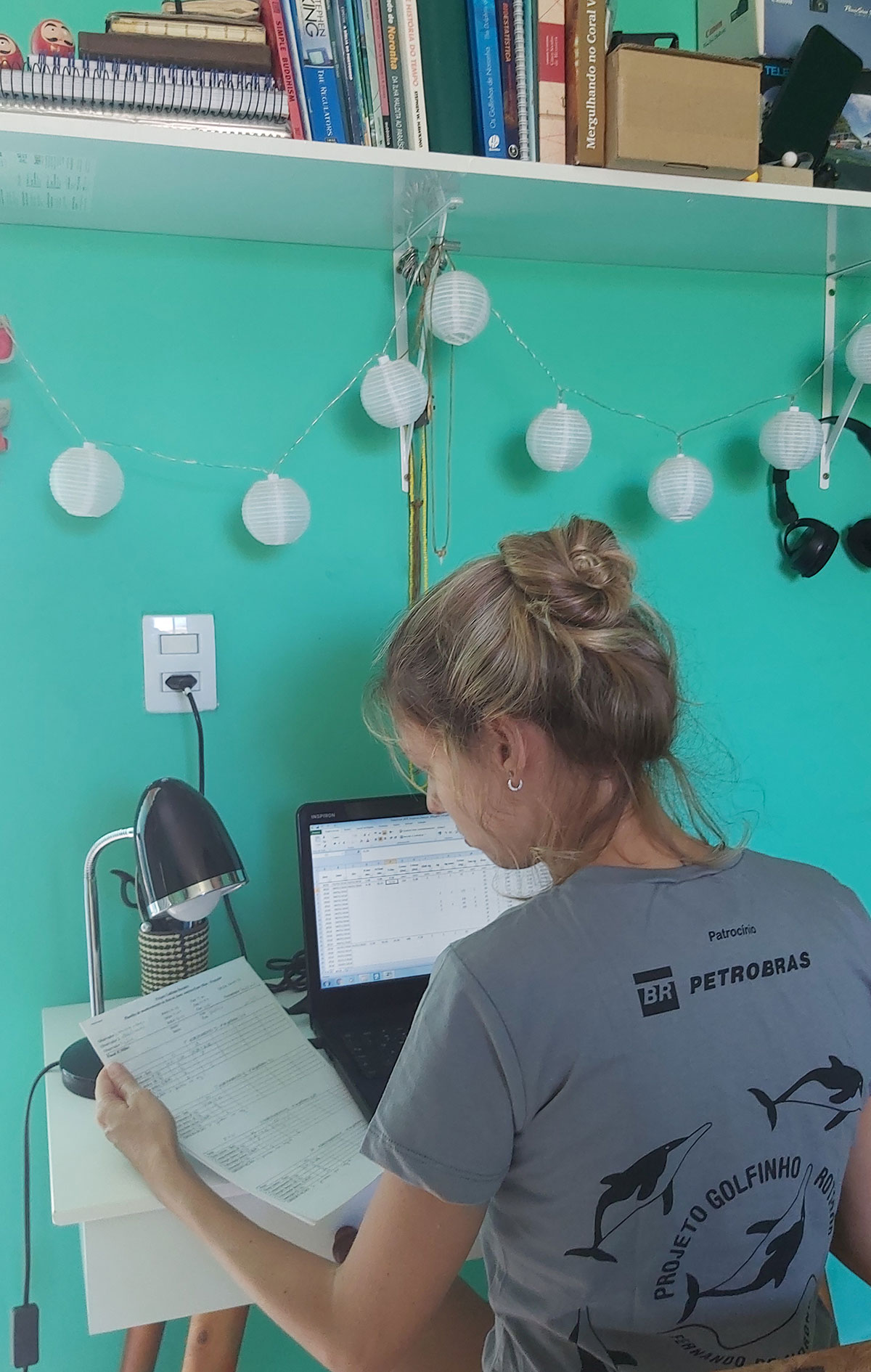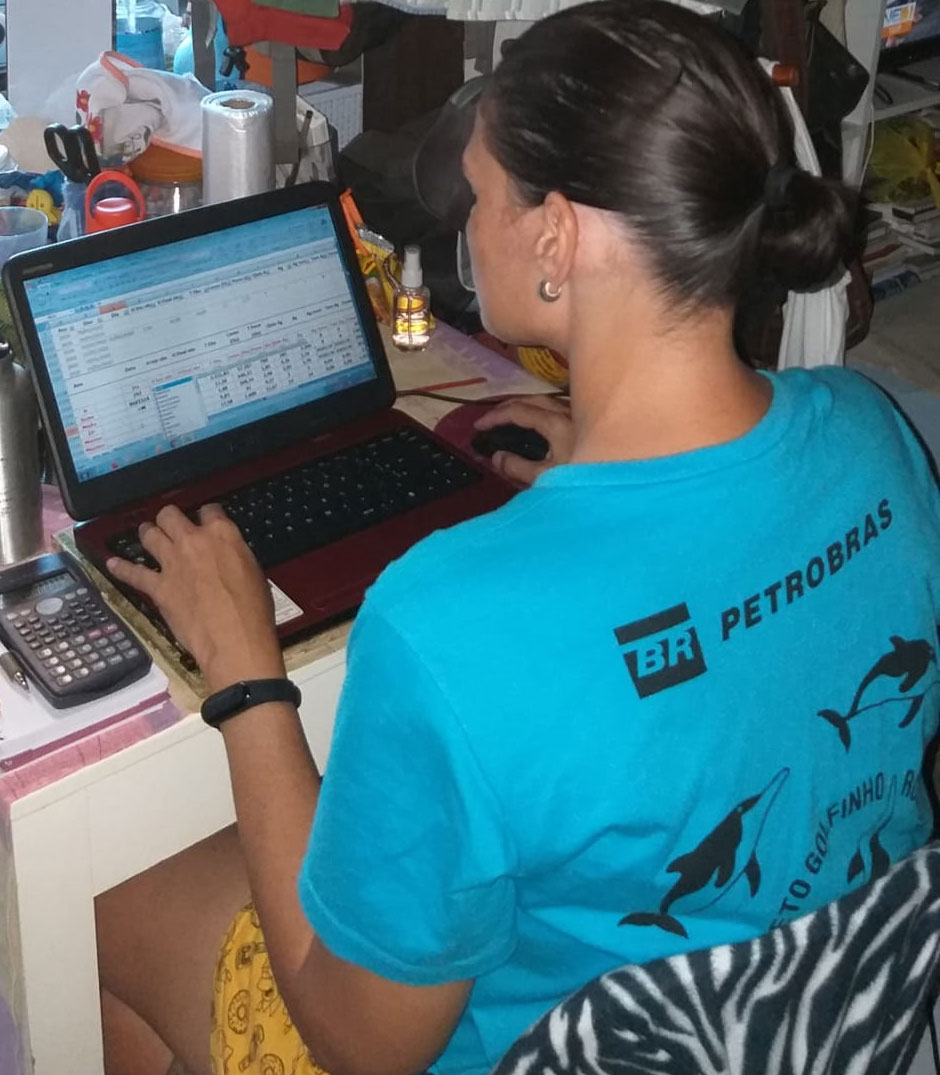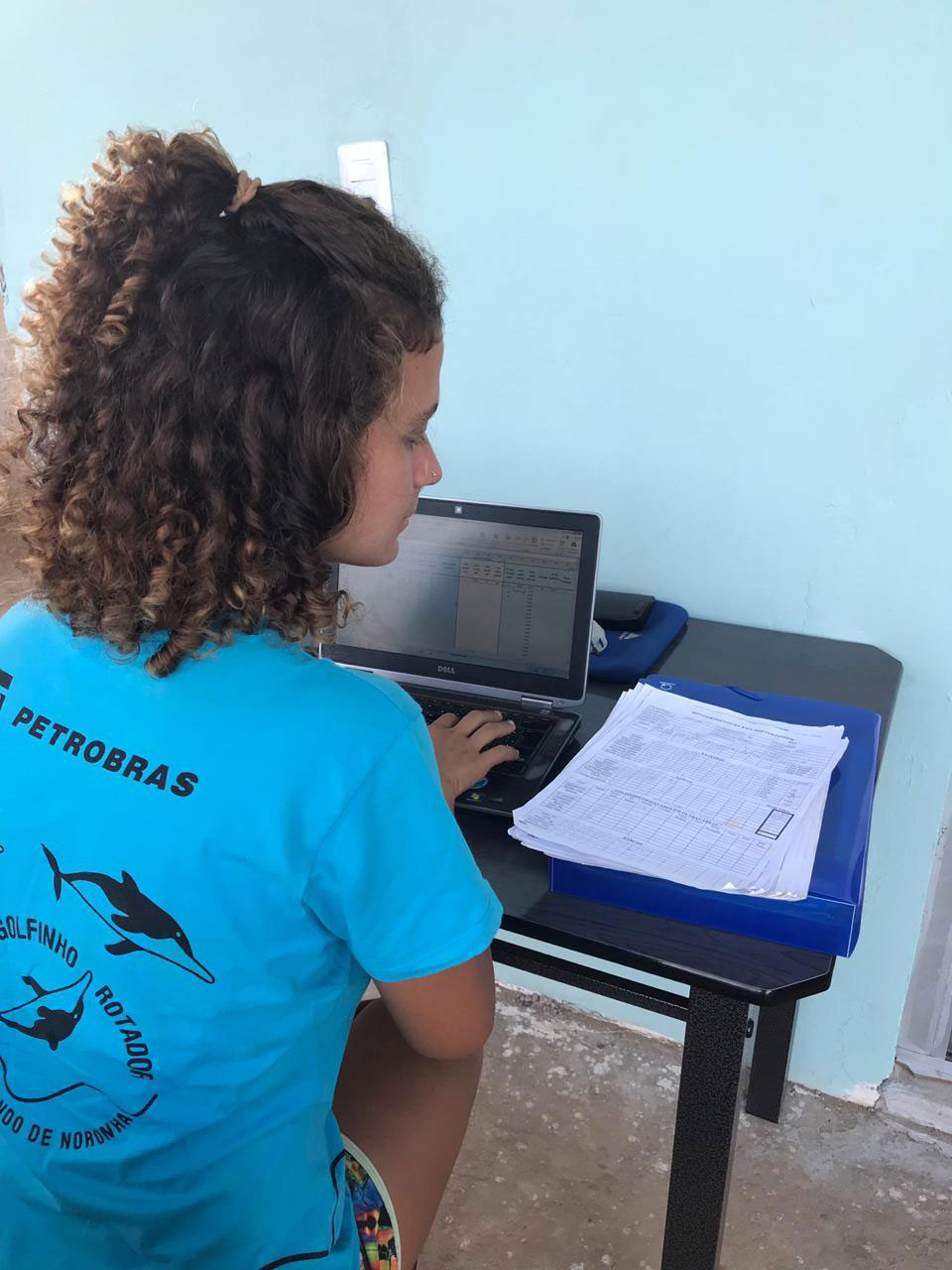 Em casa, usando computador, os pesquisadores estão processando dados coletados anteriormente. São estatísticas de informações obtidas a partir de observações feitas de barcos e também dos dois pontos fixos de monitoramento: Mirante dos Golfinhos e Forte de Nossa Senhora dos Remédios.