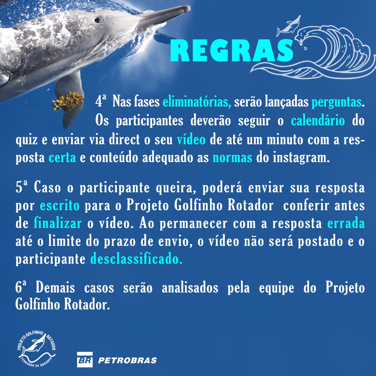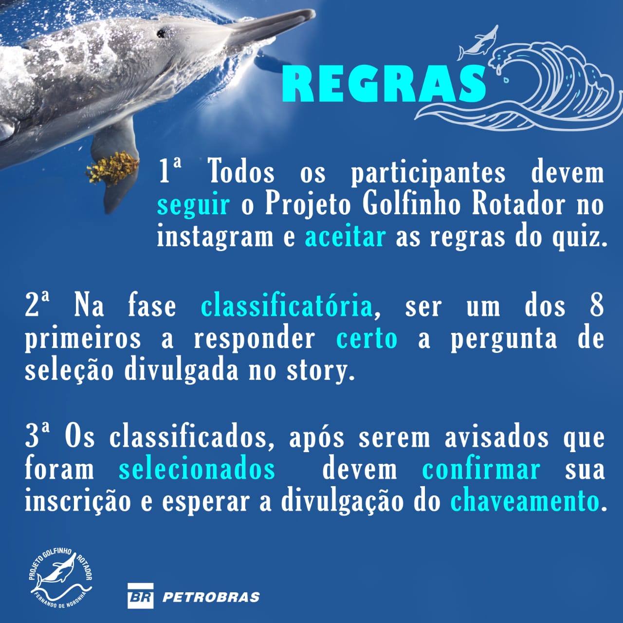 Na classificatória, será divulgada uma pergunta no story do Instagram do Projeto Golfinho Rotador, na quinta (4). Dos participantes, apenas os oito primeiros a responder certo via direct seguirão na disputa on-line.