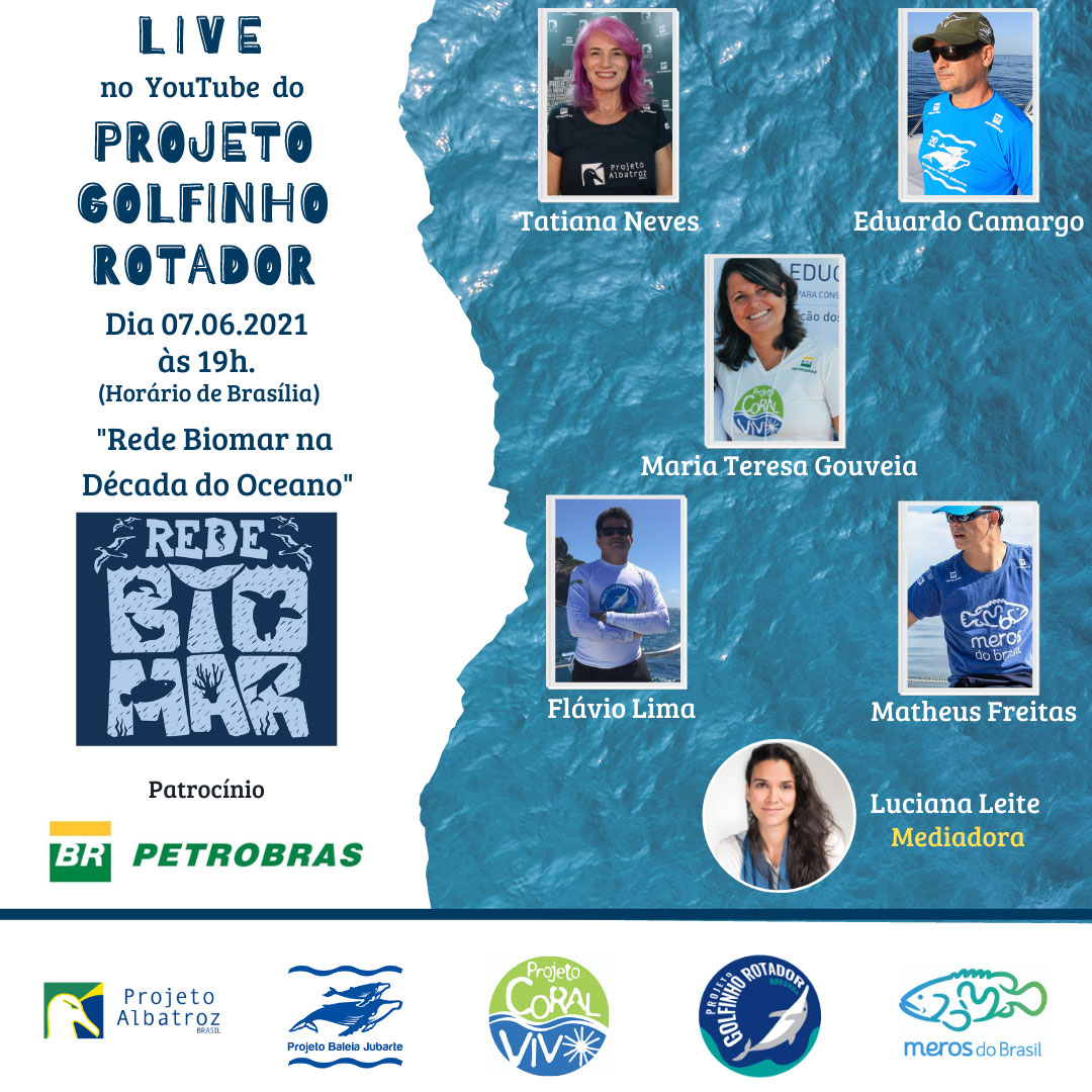 Em comemoração ao dia do Oceano, 8 de junho, o Projeto Golfinho Rotador promoveu uma Live em seu Canal YouTube Projeto Golfinho Rotador, que também foi transmitida em seu Facebook, dia 07/06, com seus projetos parceiros e pioneiros na atuação pela conservação do Oceano, os projetos da Rede Biomar: Projeto Albatroz, Projeto Baleia Jubarte, Projeto Coral Vivo e Projeto Meros do Brasil.