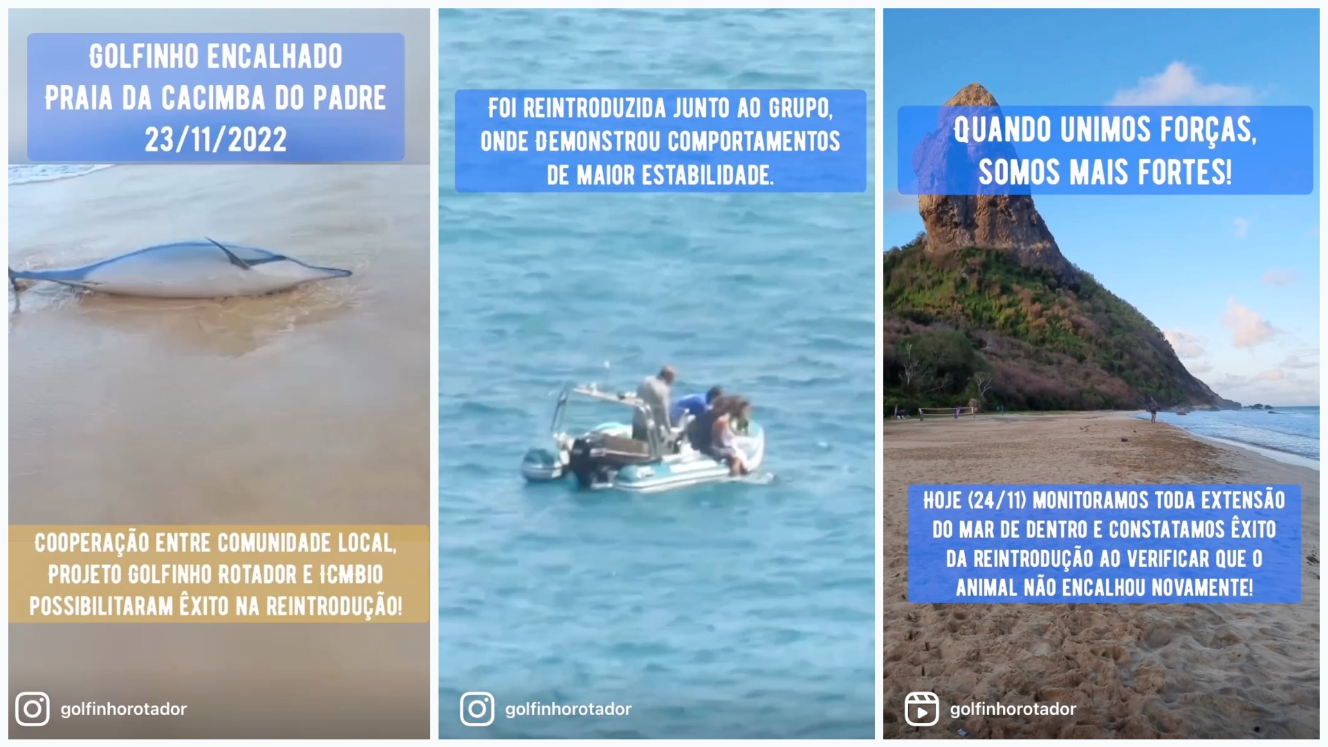 Com isso, a solução foi levar o espécime num bote até um grupo de golfinhos que estava no Porto de Santo Antônio. Para transportar o animal da praia até o bote, os pesquisadores e voluntários usaram uma prancha como se fosse uma maca. “Levamos o animal até o Porto, onde uma equipe do PGR já monitorava um grupo de golfinhos. O mamífero foi reintroduzido no mar naquela região e se misturou ao grupo”, destaca Priscila. “Acabou tudo bem”.