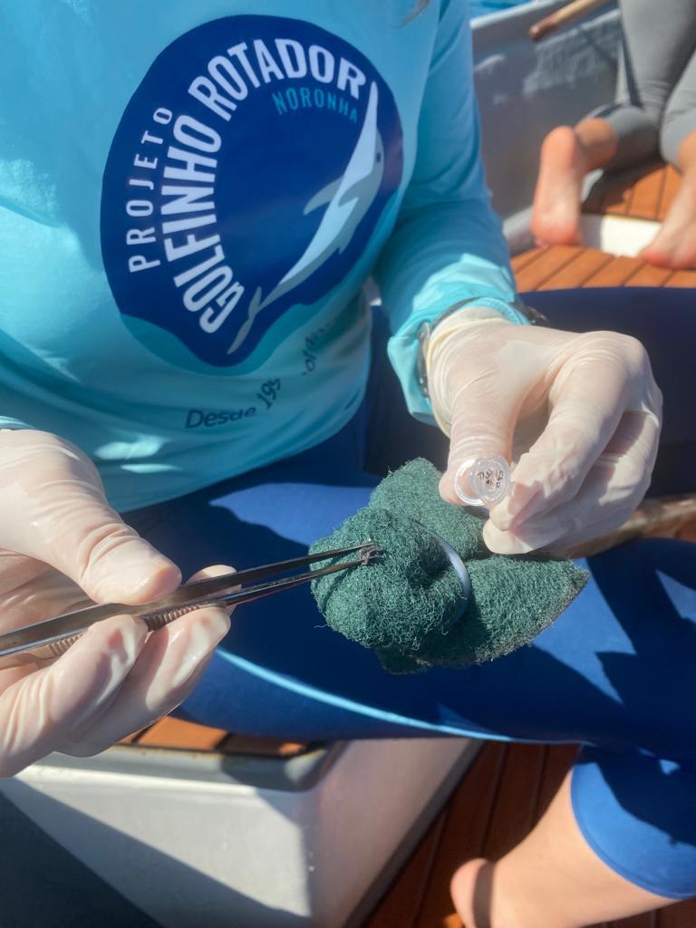 A pesquisa é feita a partir da coleta de amostras dos golfinhos da ilha, realizada com o uso de uma esponja e um leve toque na pele do animal. “Apenas passamos a esponja no dorso dos golfinhos. A pele deles sai facilmente com o contato e fica aderida”. O processo dura poucos segundos e não causa dor aos golfinhos. Durante essa fase dos estudos, os pesquisadores coletaram em Noronha por uma semana. Nesse período, obtiveram 94 amostras, a partir das quais conseguem extrair o DNA dos animais.