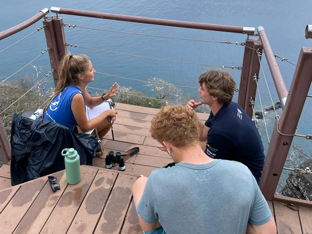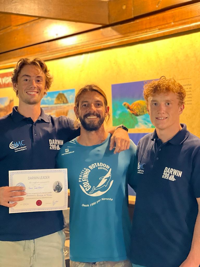 Enquanto ancorados no Porto de Noronha, um “darwin leader” e seu câmera acompanharam por três dias as atividades do Projeto Golfinho Rotador de pesquisa e monitoramento do comportamento dos golfinhos nas duas áreas de proteção ambiental, uma com total restrição para atividade turística náutica, e outra com múltiplas embarcações na mesma área de ocupação dos golfinhos, além de participarem das ações desenvolvidas dentro do sistema de educação escolar no arquipélago. “É muito especial desenvolver essa missão em um local incrível como é Fernando de Noronha, mesmo sendo um tempo curto e de muito trabalho, o ambiente torna tudo bem prazeroso”, disse Tom Schidlbauer, de 23 anos, biólogo austríaco e “darwin leader” designado a acompanhar nossas ações.