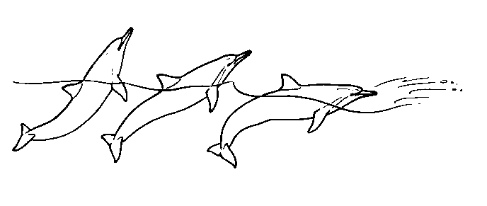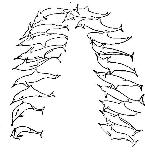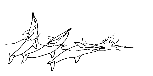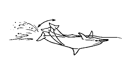 - Os golfinhos saem d’água de cabeça e com o corpo arqueado em um ângulo aproximado de 30°, sobem um ou dois metros acima da superfície e caem de cabeça, barriga ou lado. Considerada uma atividade aérea horizontal de baixo impacto e a sequência de saltos executadas por vários golfinhos simultaneamente está relacionada a uma situação de alto estresse, como fuga de tubarões ou a grande molestamento de embarcações.