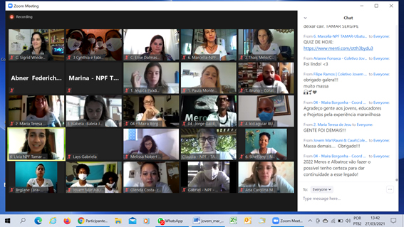 No primeiro dia do encontro, houve a apresentação dos seis projetos da Rede Biomar e dos coletivos Jovem Mar de cada localidade, destacando quem são, o que fazem e como enfrentaram a pandemia. O vídeo sobre o Jovem Mar Noronha está disponível no canal Projeto Golfinho Rotador (PGR) no YouTube. Os demais dias foram exclusivos para os jovens debaterem em salas virtuais e se conhecerem melhor, fortalecendo a relação entre eles mesmos. Também foram exibidos vídeos culturais com arte e música dos jovens que atuam nessas áreas. “Além de contribuir para o crescimento individual dos participantes, os resultados do Encontro Jovem Mar, como já vem acontecendo em edições anteriores, servirão para que os projetos da Rede Biomar aprimorem seus próprios programas educativos e de envolvimento dos jovens das comunidades nas ações de conservação do patrimônio natural costeiro e marinho do Brasil”, diz Priscila Medeiros, coordenadora geral do PGR.