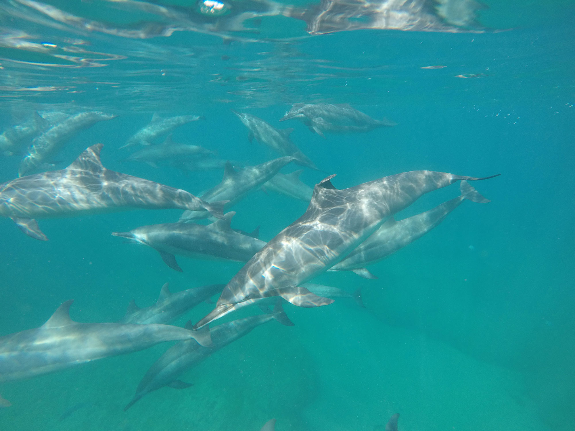 Todos os pesquisadores presentes do PGR mergulharam simultaneamente com os golfinhos das 08:08 às 09:28 para analisar o comportamento subaquático de resposta à interação com mais de 10 embarcações de turismo em 1h40min.