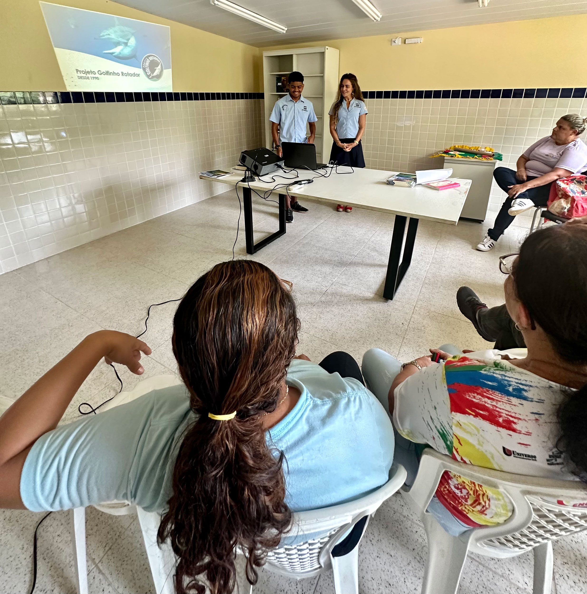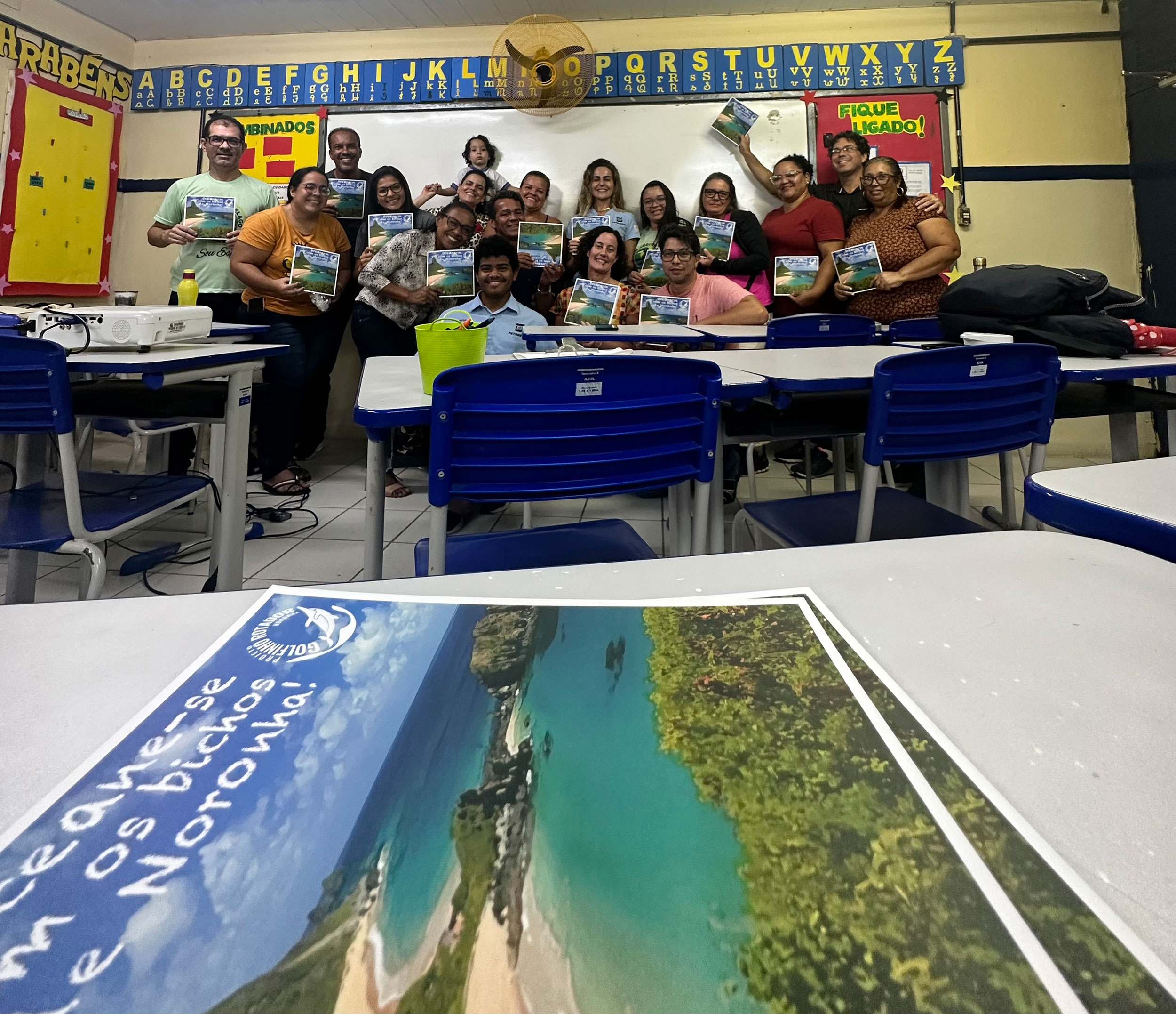 As formações ocorreram nos dias 10 e 16 de Fevereiro e foram divididas em duas partes. Na primeira, o estudante João Alison, 16 anos, aluno do Ensino Médio da Erem, ministrou uma palestra sobre o trabalho do PGR e curiosidades a respeito dos golfinhos. Na segunda, Cynthia Gerling apresentou o caderno de colorir “Oceane-se com os Bichos de Noronha”, com ilustrações de treze animais da ilha, dos quais onze estão ameaçados de extinção. Entre as espécies incluídas no livro, estão o golfinho-rotador, a baleia-jubarte, o tubarão-limão, o peixe-papagaio, a raia-manta e o mero. Com 32 páginas e desenhos de várias espécies de peixes, aves, répteis e mamíferos, o livro encantou os professores e será usado durante o ano letivo nas escolas de Noronha. “É um material lúdico, com informações sobre cada animal. Assim, as crianças aprendem e exercitam a criatividade ao mesmo tempo”, declara Cynthia Gerling, autora dos textos da obra, enquanto as ilustrações foram feitas por Melyna Lyra, que também é pesquisadora do PGR.