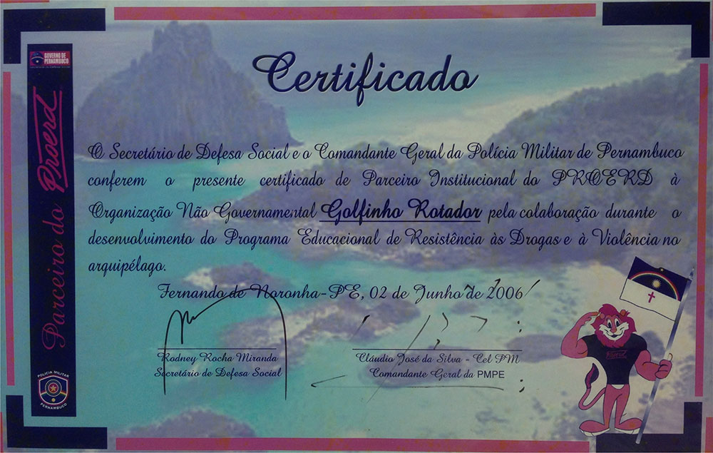 Em 2012 e 2013 o Projeto Golfinho Rotador foi contemplado com esse Diploma de Honra ao Mérito em virtude de suas ações locais que beneficiaram: os alunos da Escola Arquipélago na temática Educação Ambiental; jovens que receberam cursos profissionalizantes na área do Ecoturismo; e, ao Projeto de Sustentabilidade, que contemplou 75 Pousadas em Fernando de Noronha, no âmbito de como implementar uma Gestão Sustentável nos Meios de Hospedagem de Fernando de Noronha.